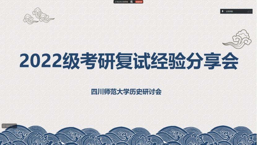 为帮助考生精准把握复试要点、科学高效备考,切实提升复试竞争力,3月7日、8日的19:00-21:00,四川师范大学历史研讨会以线上会议形式,特邀多所高校的在读硕士生分享复试经验。本次分享会聚焦不同院校复试特点与实用备考策略,为备考学子提供了全面、深入、可操作的复试指导,助力同学们从容应战。