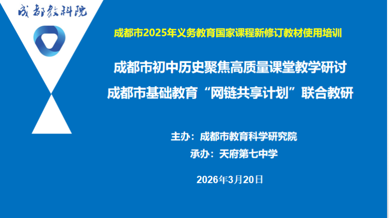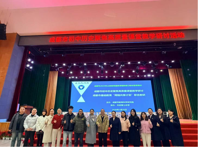 2026年3月20日,由成都市教育科学研究院主办、成都天府第七中学承办的成都市初中历史聚焦高质量课堂教学研讨暨成都市基础教育“网链共享计划”联合教研活动顺利开展。我校历史学专业本科2025届校友、任教于成都天府第七中学的廖新宇老师受邀参加本次市级大型教研盛会,这位在校期间曾斩获川渝第二届师范生教学能力大赛(决赛)一等奖的优秀师范毕业生,凭借扎实的专业积淀打磨原创项目式学习课例,现场展示后,赢得全市历史教育同仁的高度认可与广泛赞誉。